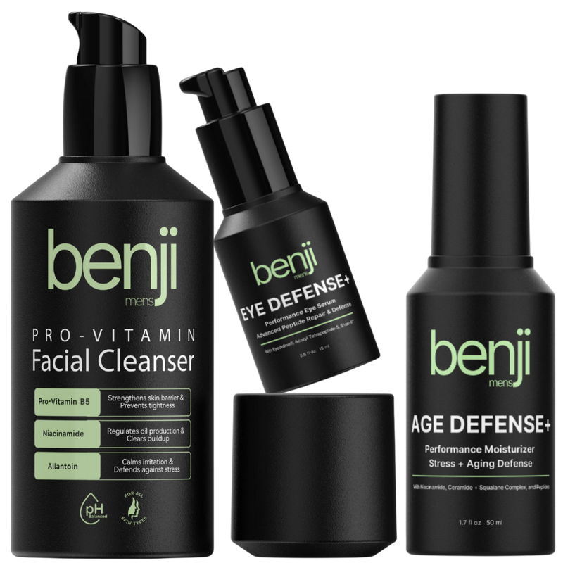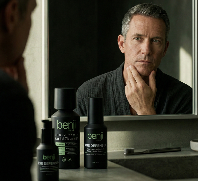 Elevated cortisol, DHT shifts, blue light, compressed sleep. These show up on your face. Benji was formulated specifically around this hormonal reality.